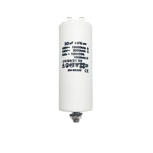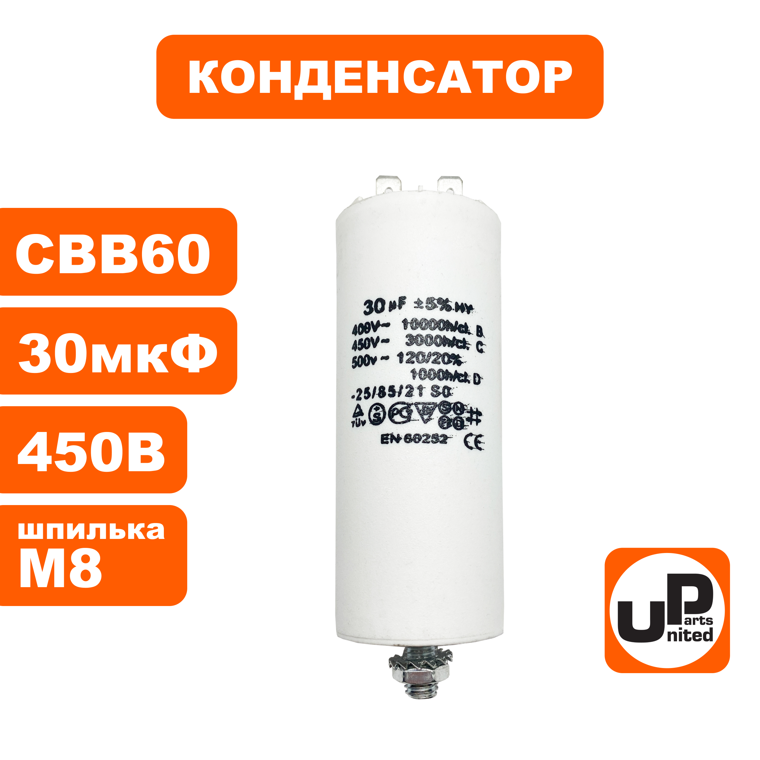 Конденсатор UNITED PARTS CBB60, 30 мкФ, 450В, 2 клеммы, шпилька M8 (90-0993)