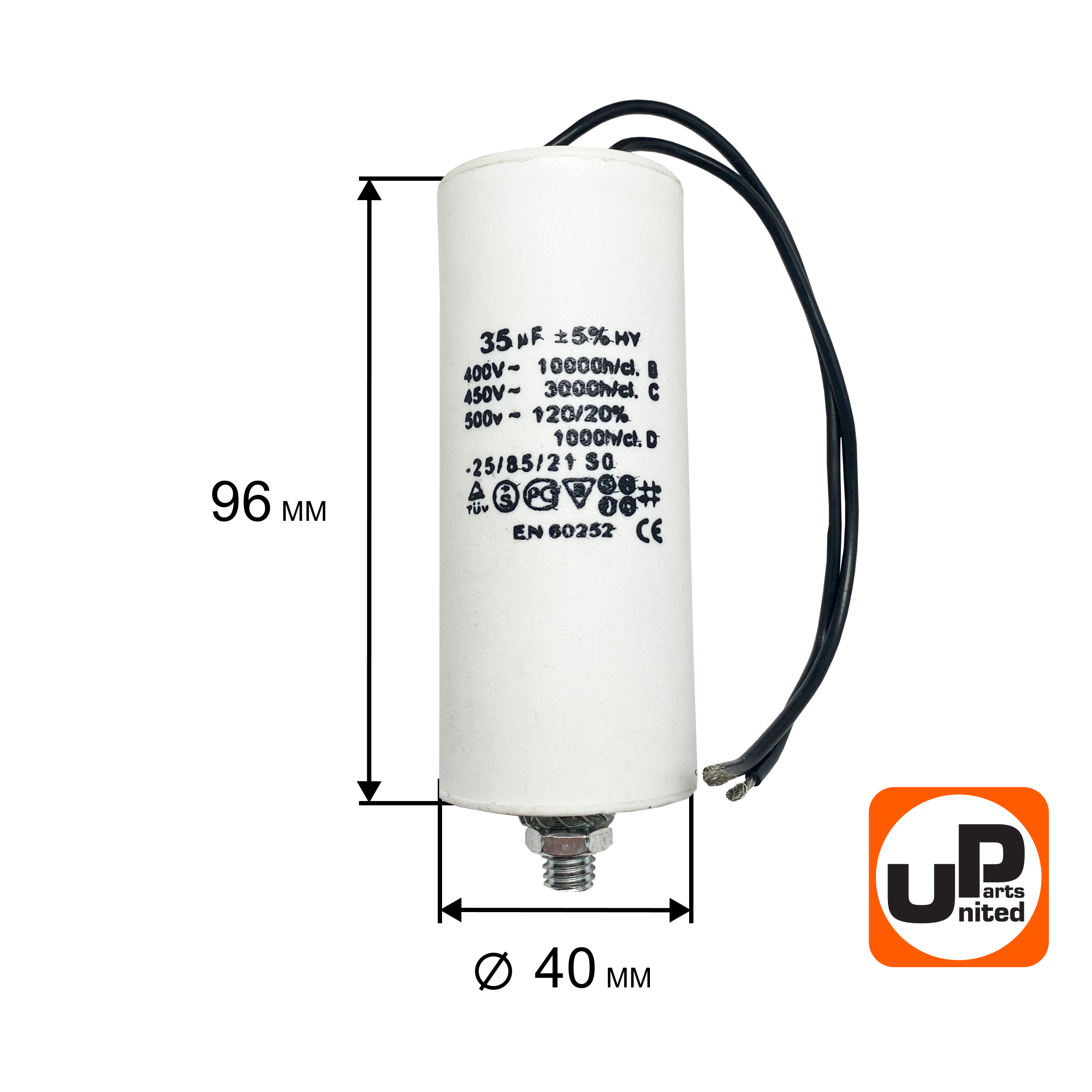 Конденсатор UNITED PARTS CBB60, 35 мкФ, 450В, гибкие выводы+шпилька (90-0336)