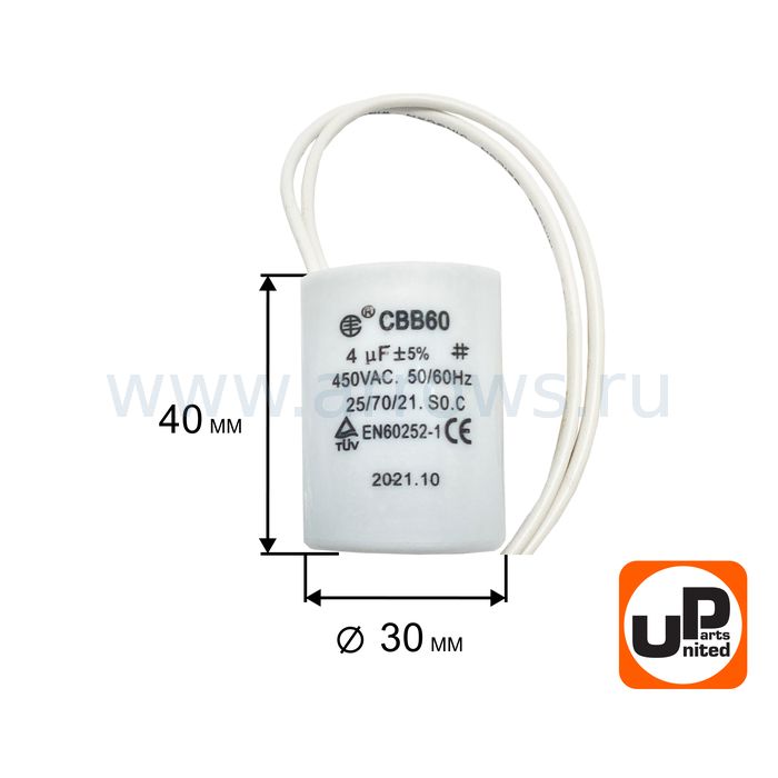 Конденсатор UNITED PARTS CBB60, 4 мкФ, 450В, гибкие выводы (90-0320) - цена, фото, технические характеристики