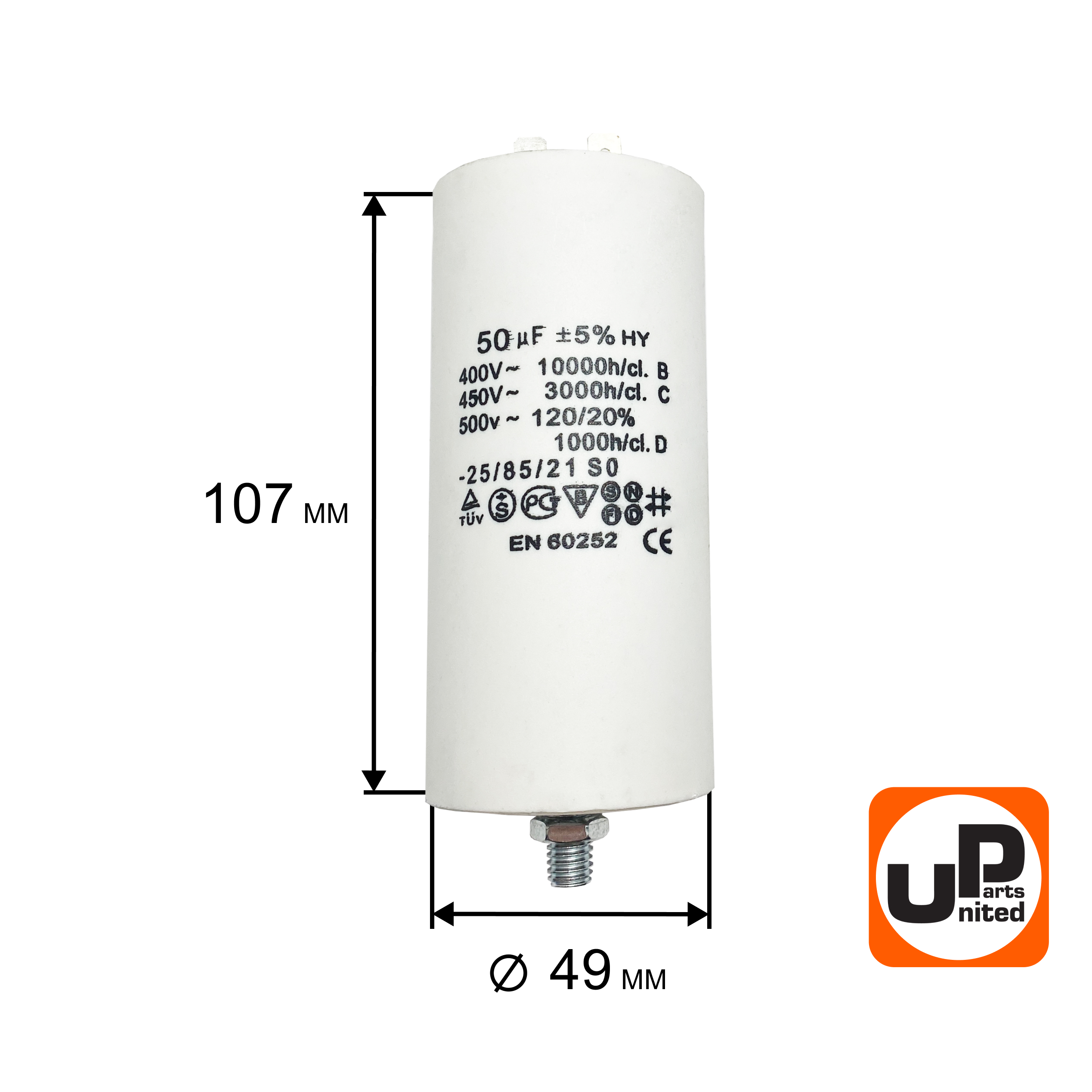 Конденсатор UNITED PARTS CBB60, 50 мкФ, 450В, 2 клеммы, шпилька M8 (90-0997)