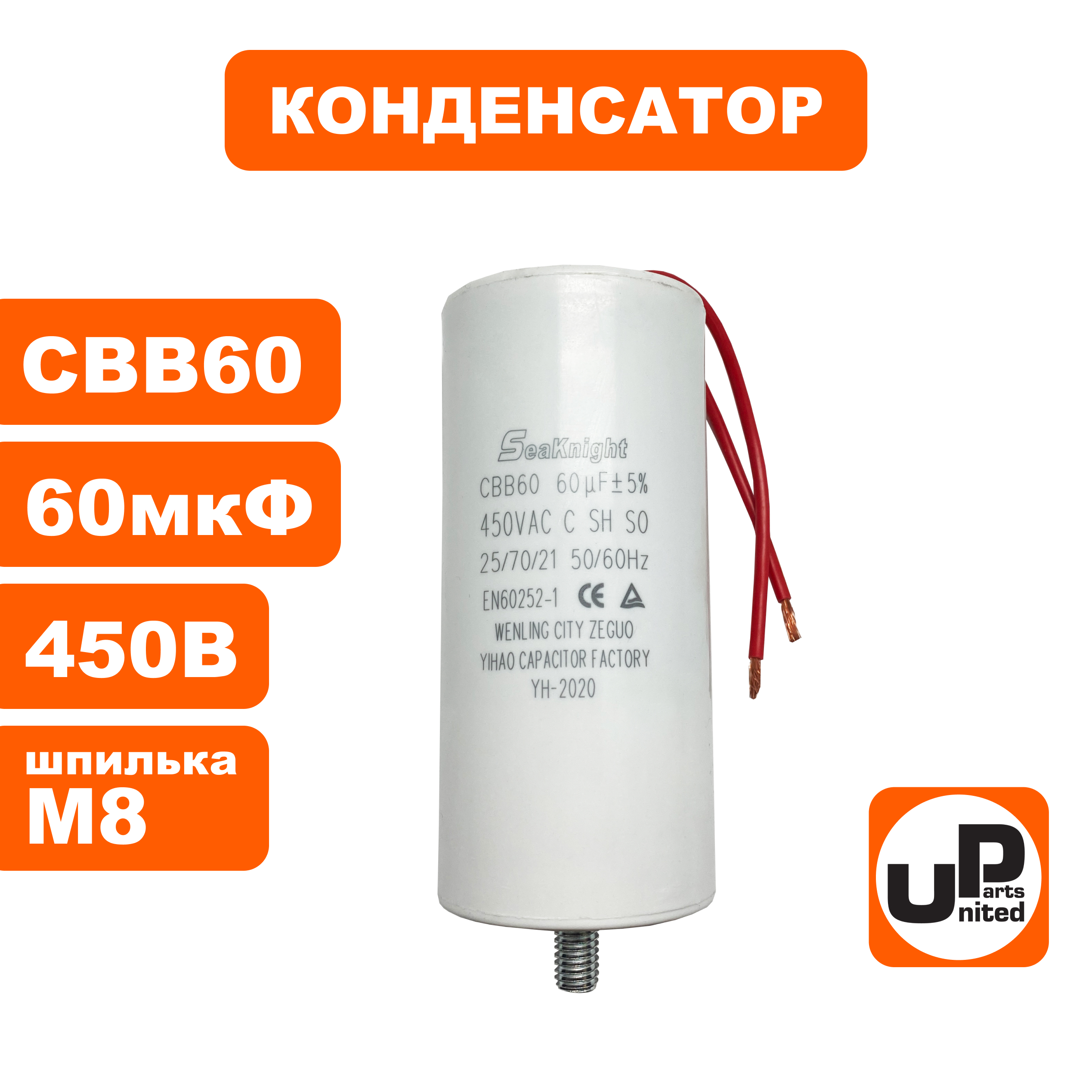 Конденсатор UNITED PARTS CBB60, 60 мкФ, 450В, гибкие выводы+шпилька (90-0339) - цена, фото, технические характеристики