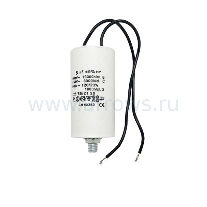 Конденсатор UNITED PARTS CBB60, 8 мкФ, 450В, гибкие выводы, шпилька М8 (90-1000) - цена, фото, технические характеристики