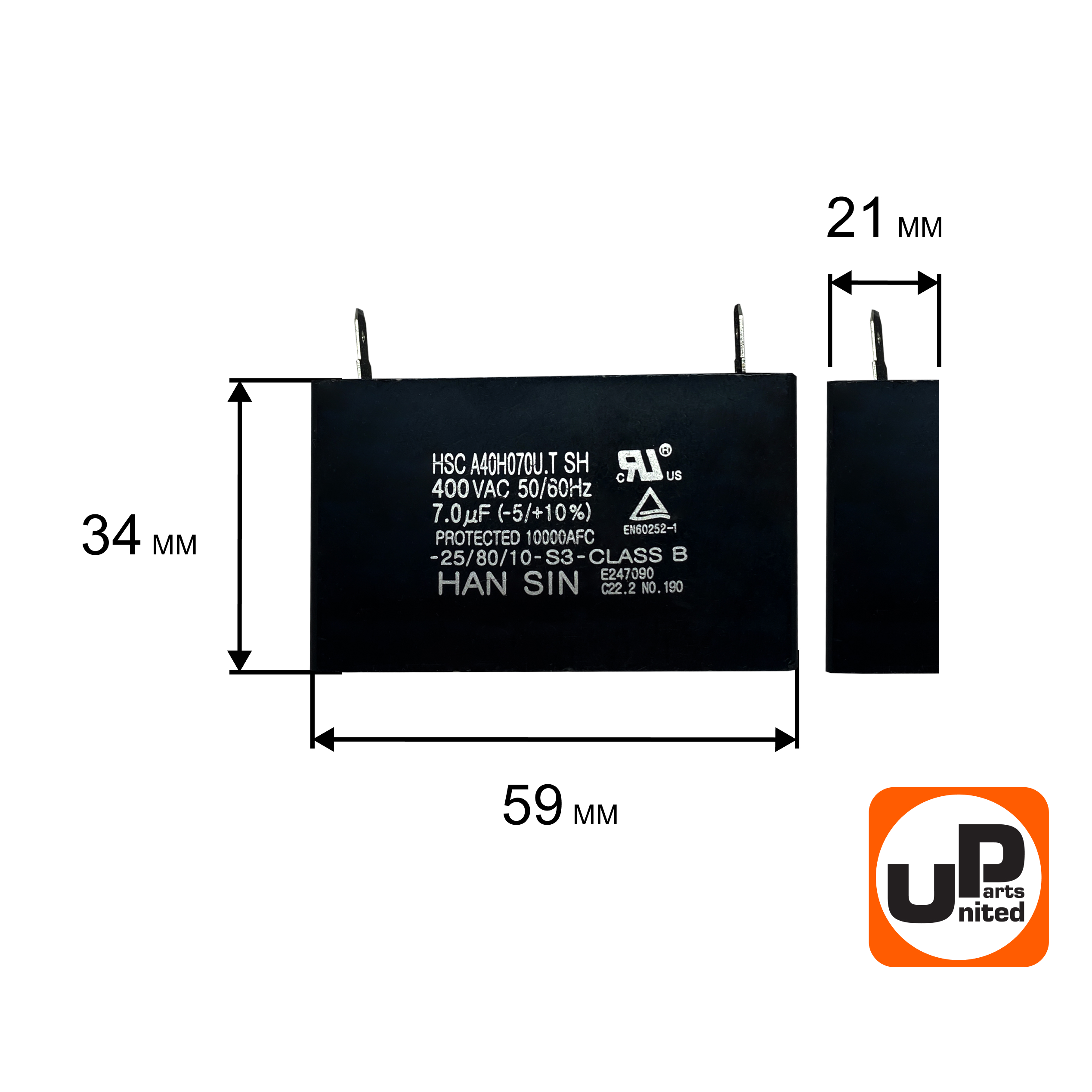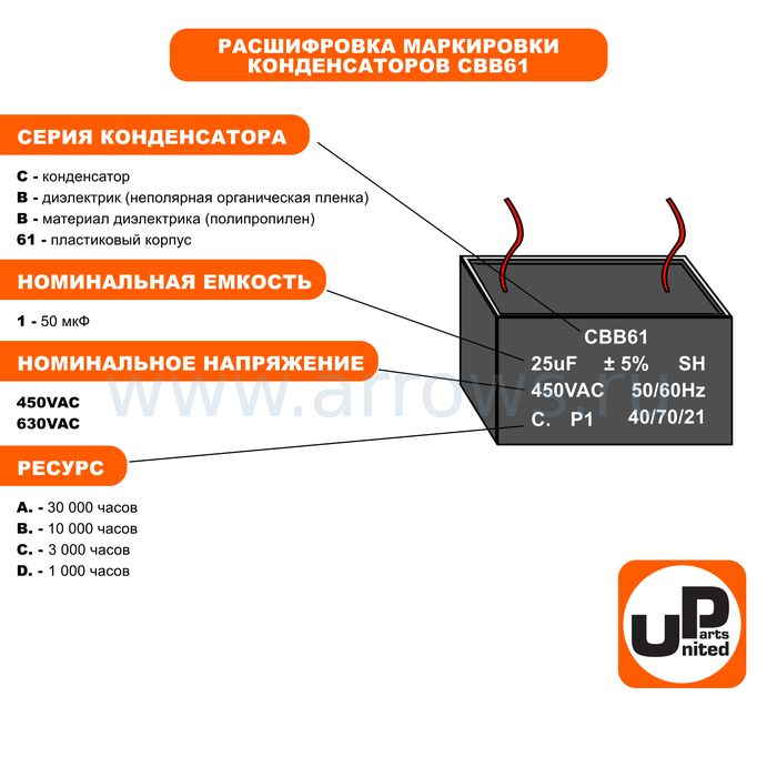 Конденсатор UNITED PARTS CBB61, 7 мкФ, 400В, клеммы (90-0345) - цена, фото, технические характеристики