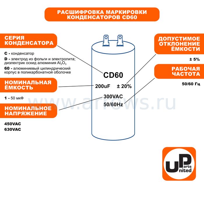 Конденсатор UNITED PARTS CD60, 150 мкФ ,250В, клеммы (90-1011) - цена, фото, технические характеристики