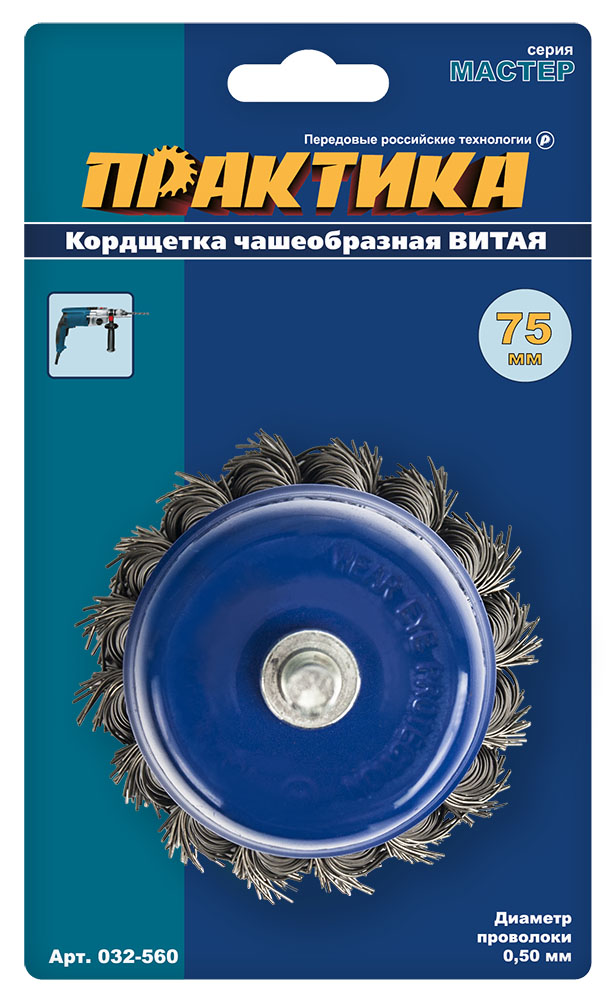 Кордщетка для дрели чашеобразная витая ПРАКТИКА 75 мм, хвост 6 мм (032-560) - цена, фото, технические характеристики