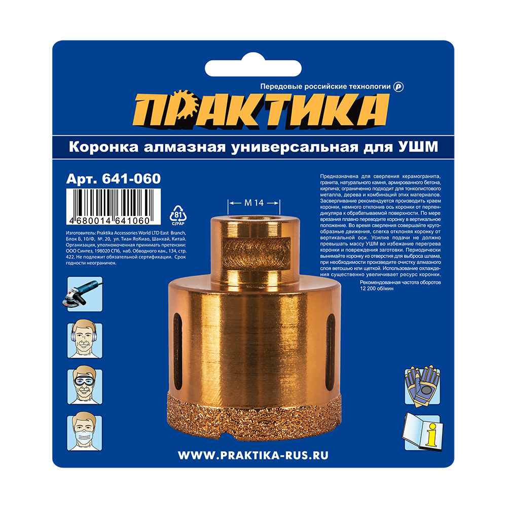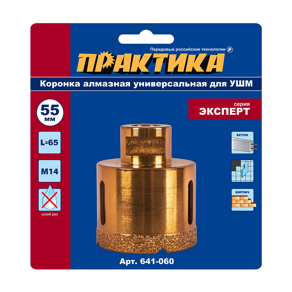 Коронка алмазная для УШМ ПРАКТИКА "Эксперт" 55 мм (1шт) блистер (641-060) - цена, фото, технические характеристики