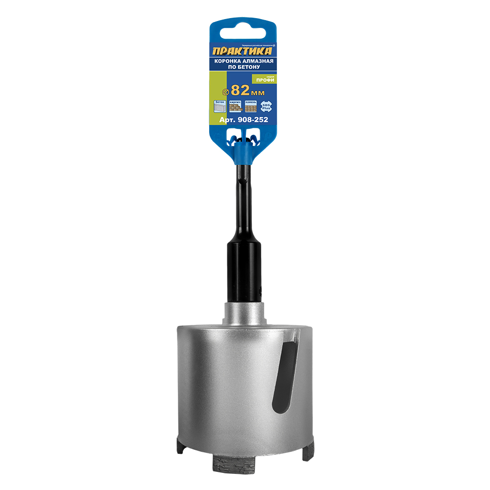 Коронка алмазная по бетону ПРАКТИКА "Профи" по бетону SDS-plus безударная 82 мм 4 сегмента высотой 10мм (908-252) - цена, фото, технические характеристики