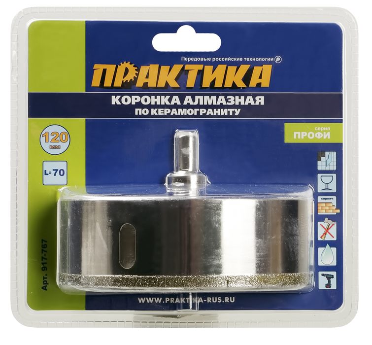 Коронка алмазная ПРАКТИКА "Профи" по керамограниту/керамике 120х70мм, пилотное сверло (1шт) блистер (917-767) - цена, фото, технические характеристики
