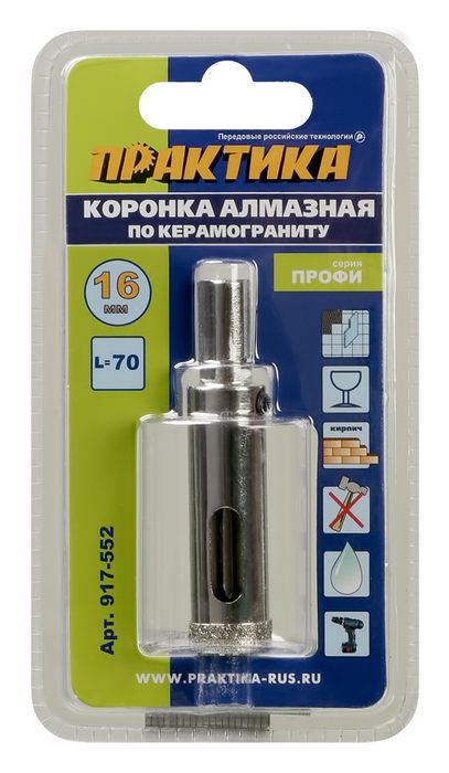 Коронка алмазная ПРАКТИКА "Профи" по керамограниту/керамике 16х70мм, пилотное сверло (1шт) блистер (917-552) - цена, фото, технические характеристики