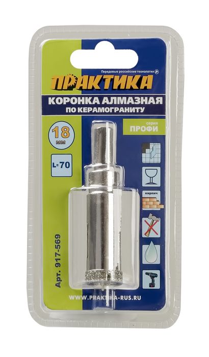 Коронка алмазная ПРАКТИКА "Профи" по керамограниту/керамике 18х70мм, пилотное сверло (1шт) блистер (917-569) - цена, фото, технические характеристики