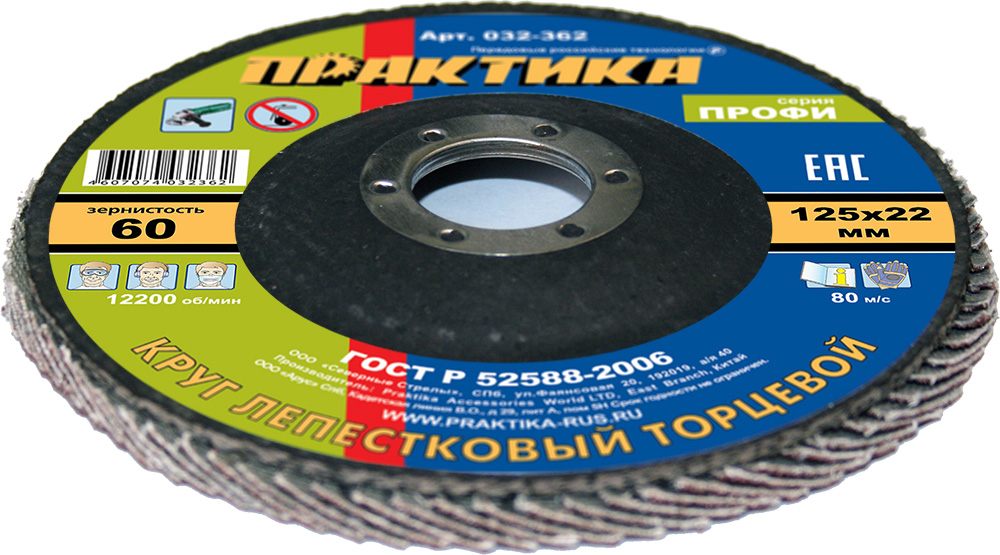 Круг лепестковый шлифовальный ПРАКТИКА 125 х 22 мм Р 60 (1шт.) серия Профи (032-362) - цена, фото, технические характеристики
