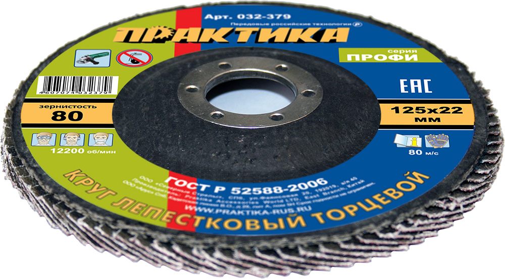 Круг лепестковый шлифовальный ПРАКТИКА 125 х 22 мм Р 80 (1шт.) серия Профи (032-379) - цена, фото, технические характеристики