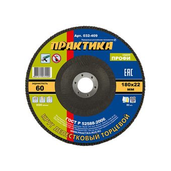 Круг лепестковый шлифовальный ПРАКТИКА 180 х 22 мм Р60 (1шт.) серия Профи (032-409)
