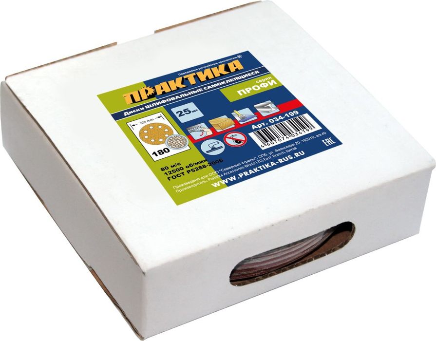 Круги шлифовальные на липкой основе ПРАКТИКА 8 отверстий, 125 мм P180 (25шт.) коробка (034-199) - цена, фото, технические характеристики