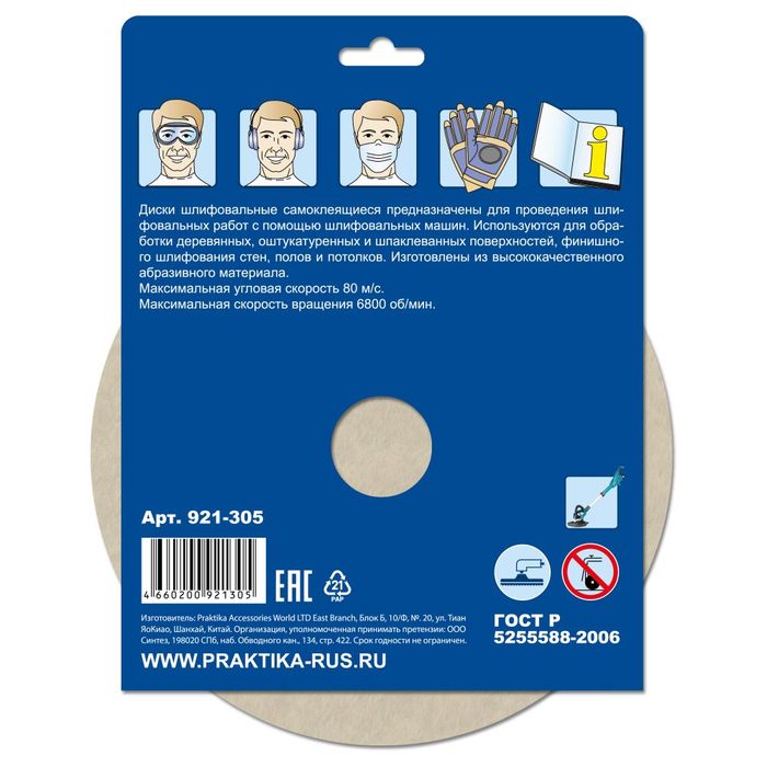 Круги шлифовальные на липкой основе ПРАКТИКА БЕЗ отверстий 225 мм, P 60 (5шт.) картонный подвес (921-305) - цена, фото, технические характеристики