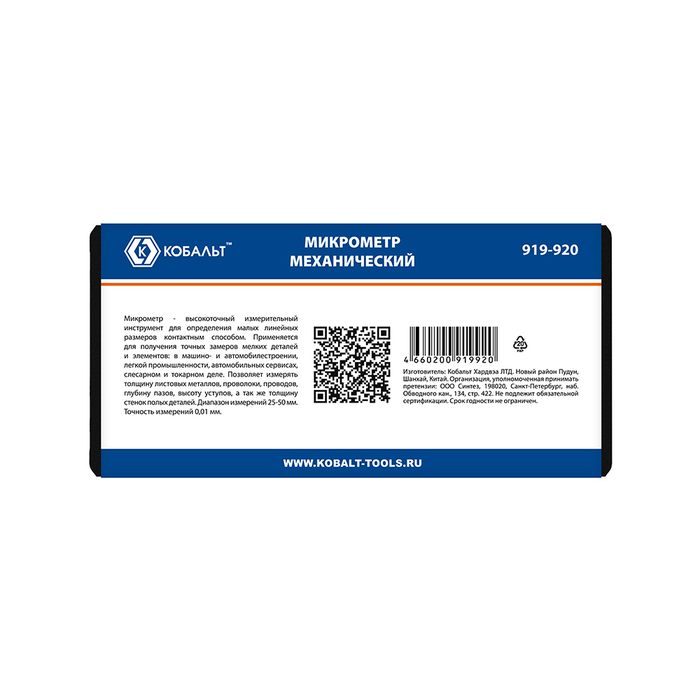 Микрометр КОБАЛЬТ механический, диапазон измерений 25-50 мм, точность 0,01 мм, кейс (919-920) - цена, фото, технические характеристики