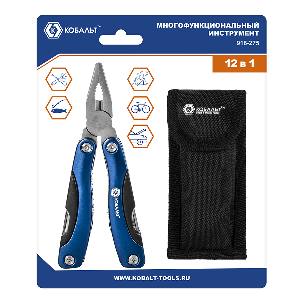Мультитул КОБАЛЬТ 12 в 1, корпус из нерж.стали, рукоятки из алюминия, чехол для хранения, блистер (918-275) - цена, фото, технические характеристики