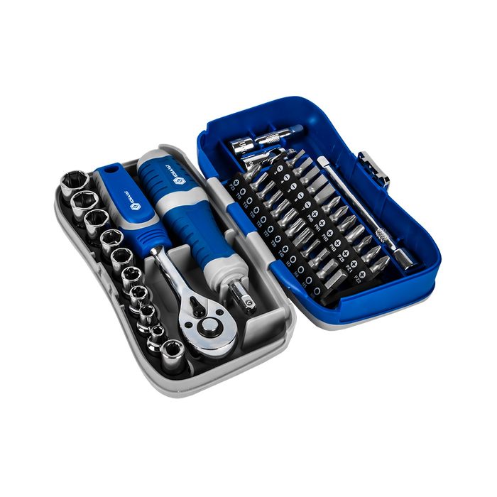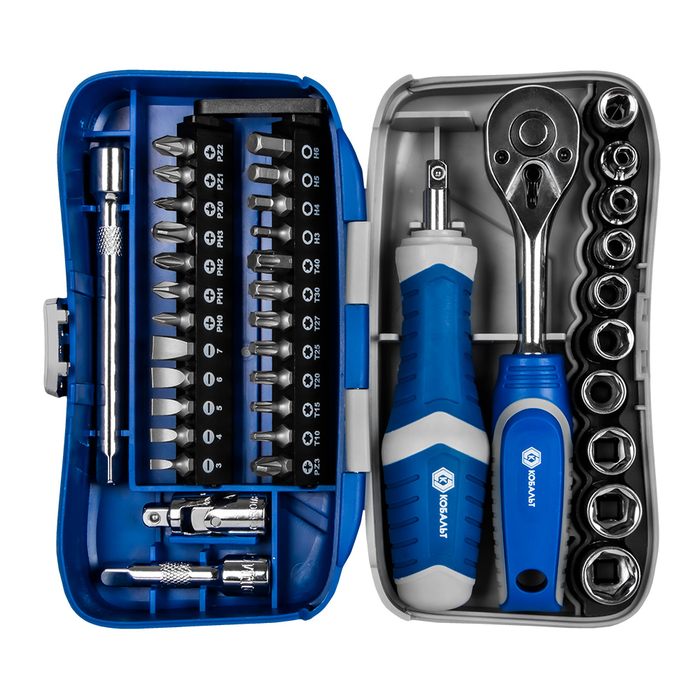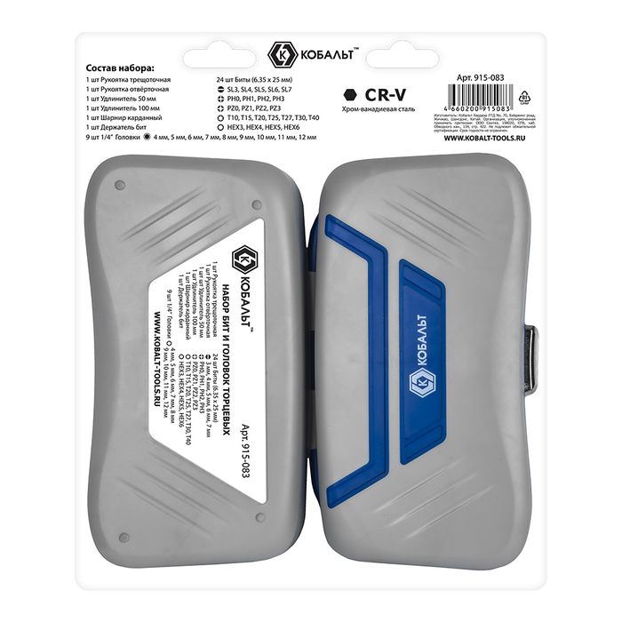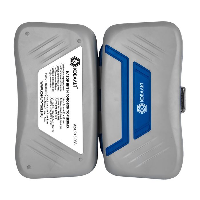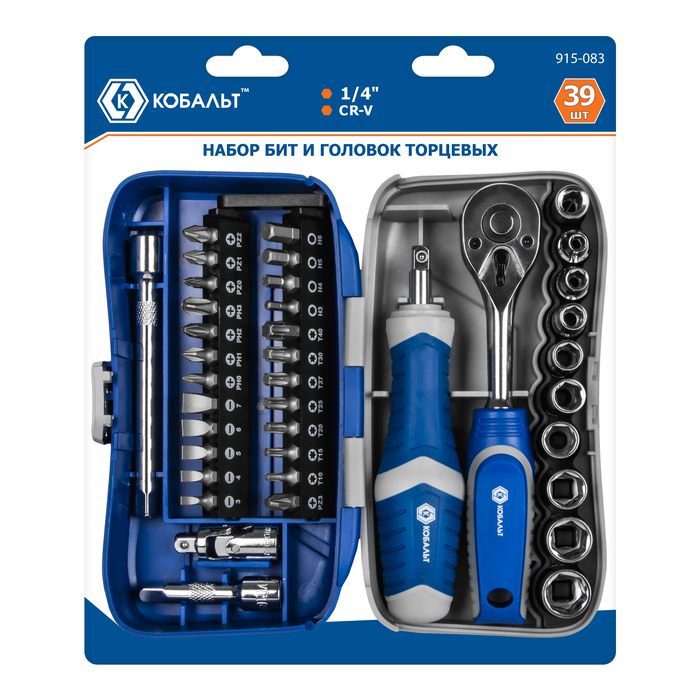 Набор бит и головок с трещоткой КОБАЛЬТ 39 пр.,CR-V (24 биты, 9 головок, трещотка, отв.рук., 2 удл., шарнир, держ.бит),кейс+блист.(915-083) - цена, фото, технические характеристики