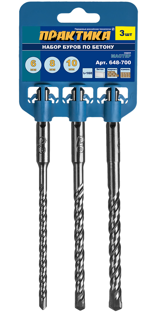 Набор буров SDS-plus ПРАКТИКА 6,8,10 х 160 мм, 3 шт "Мастер", клипса (648-700) - цена, фото, технические характеристики