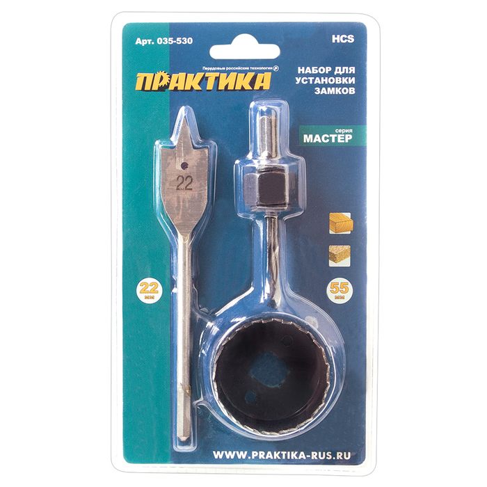 Набор для установки замков ПРАКТИКА : коронка 55 х 20 мм, перовое сверло 22 мм блистер (035-530) - цена, фото, технические характеристики