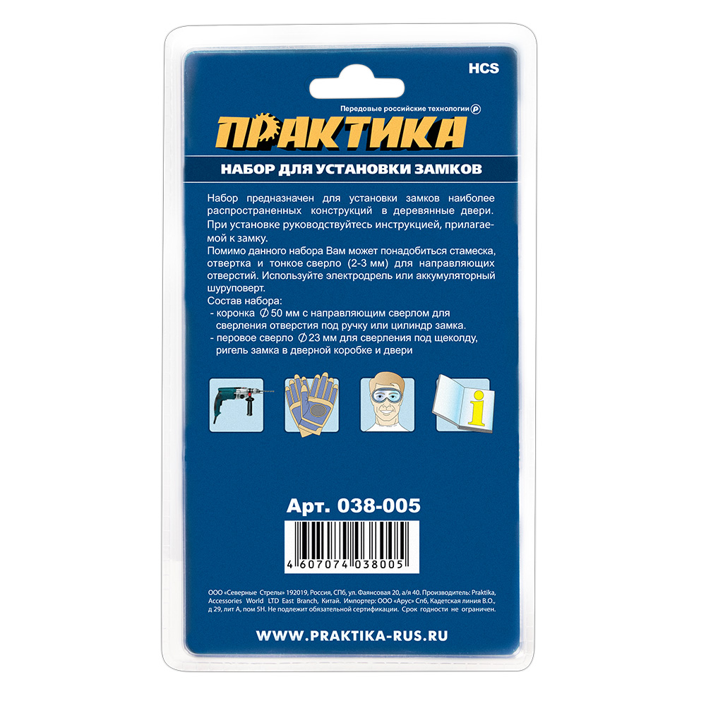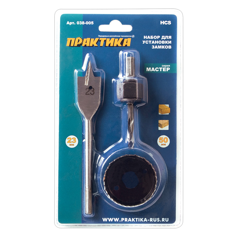 Набор для установки замков ПРАКТИКА коронка 50 х 20 мм, перовое сверло 23 мм блистер (038-005) - цена, фото, технические характеристики