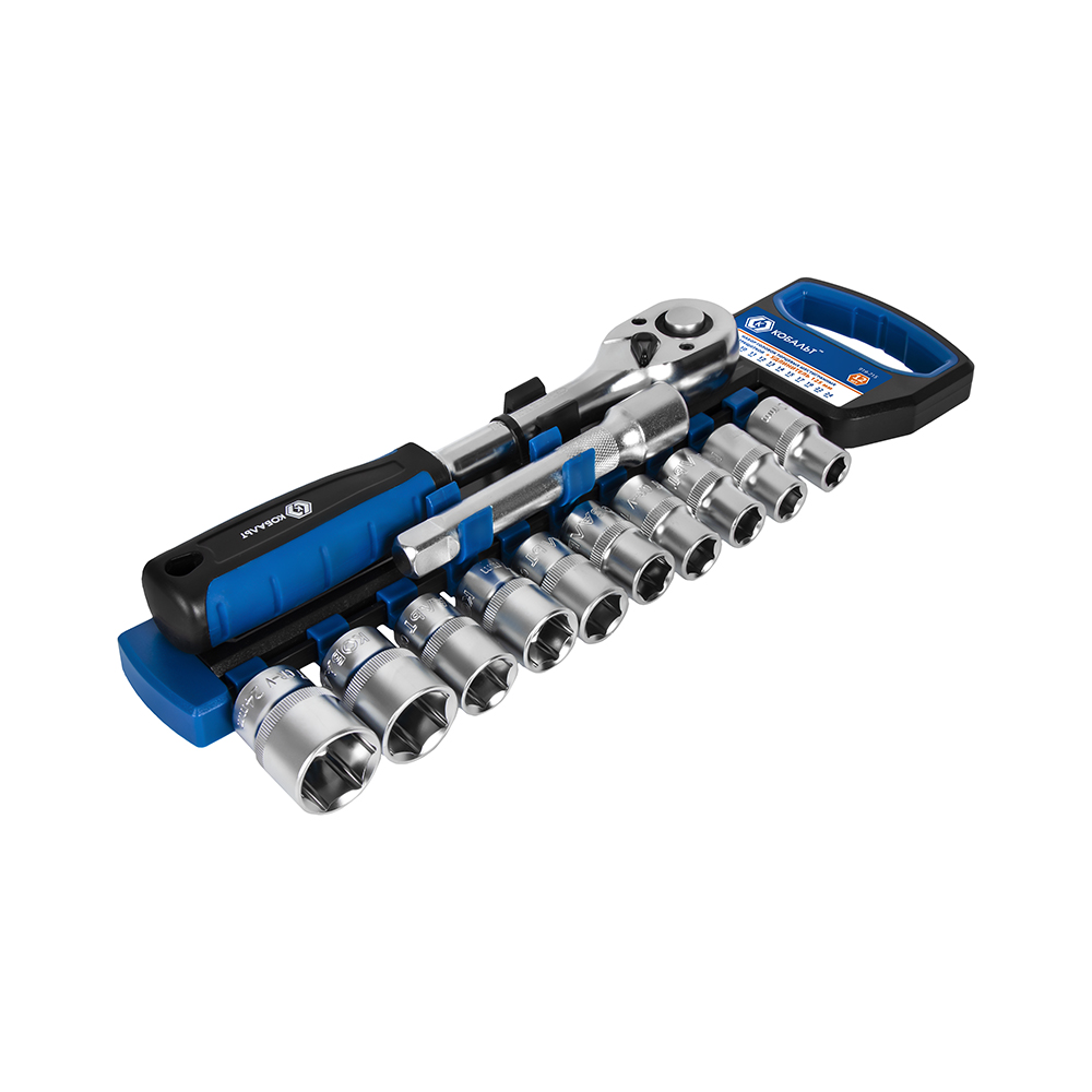 Набор головок торцевых КОБАЛЬТ 1/2": 10, 11, 12, 13, 14, 15, 17, 19, 22, 24 мм + трещоточная рукоятка, 12 ПРЕДМЕТОВ, CR-V, подвес (919-715) - цена, фото, технические характеристики