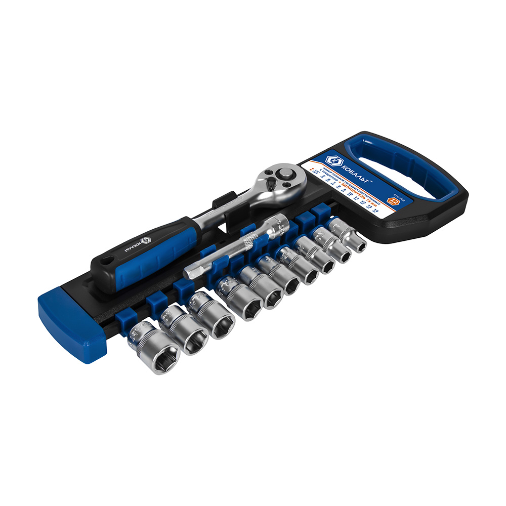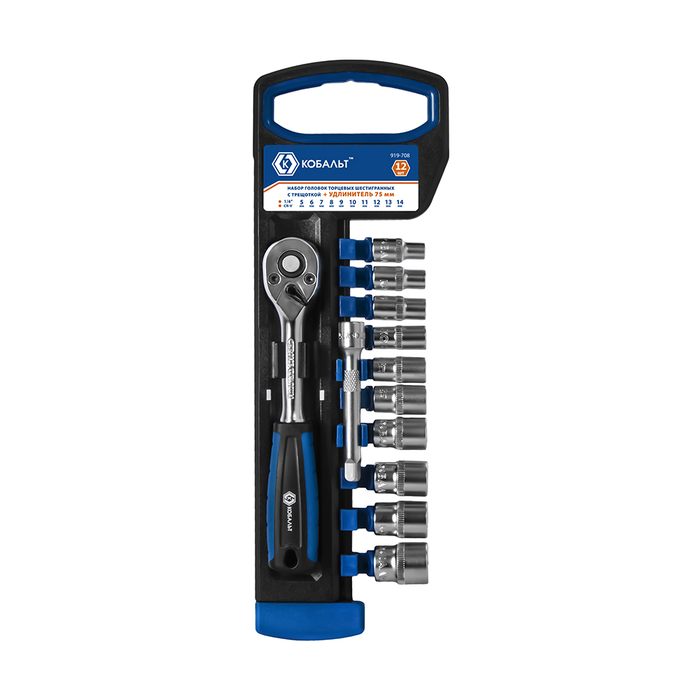 Набор головок торцевых КОБАЛЬТ 1/4": 5, 6, 7, 8 ,9, 10, 11, 12, 13, 14 мм + трещоточная рукоятка, 12 ПРЕДМЕТОВ, CR-V, подвес (919-708) - цена, фото, технические характеристики