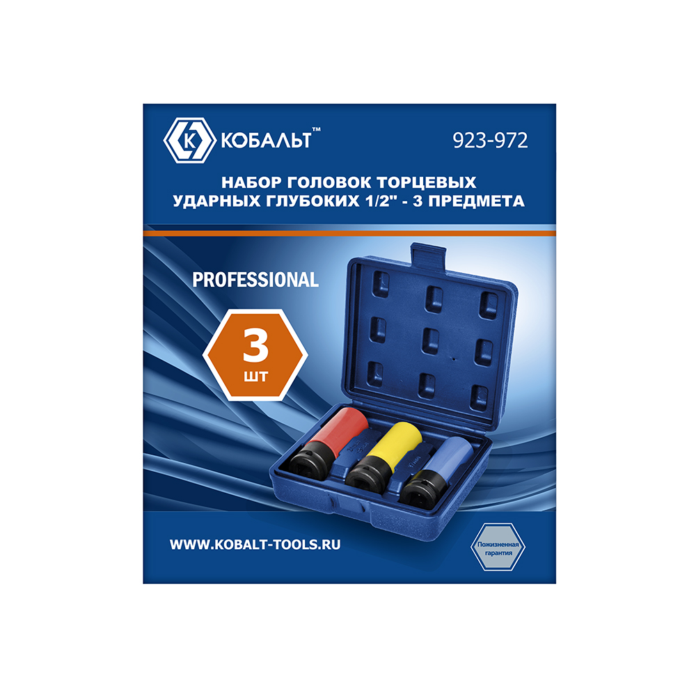Набор головок торцевых ударных глубоких КОБАЛЬТ 1/2": 17, 19, 21 мм, для легкосплавных колесных дисков, CR-MO, 3 шт., кейс (923-972) - цена, фото, технические характеристики