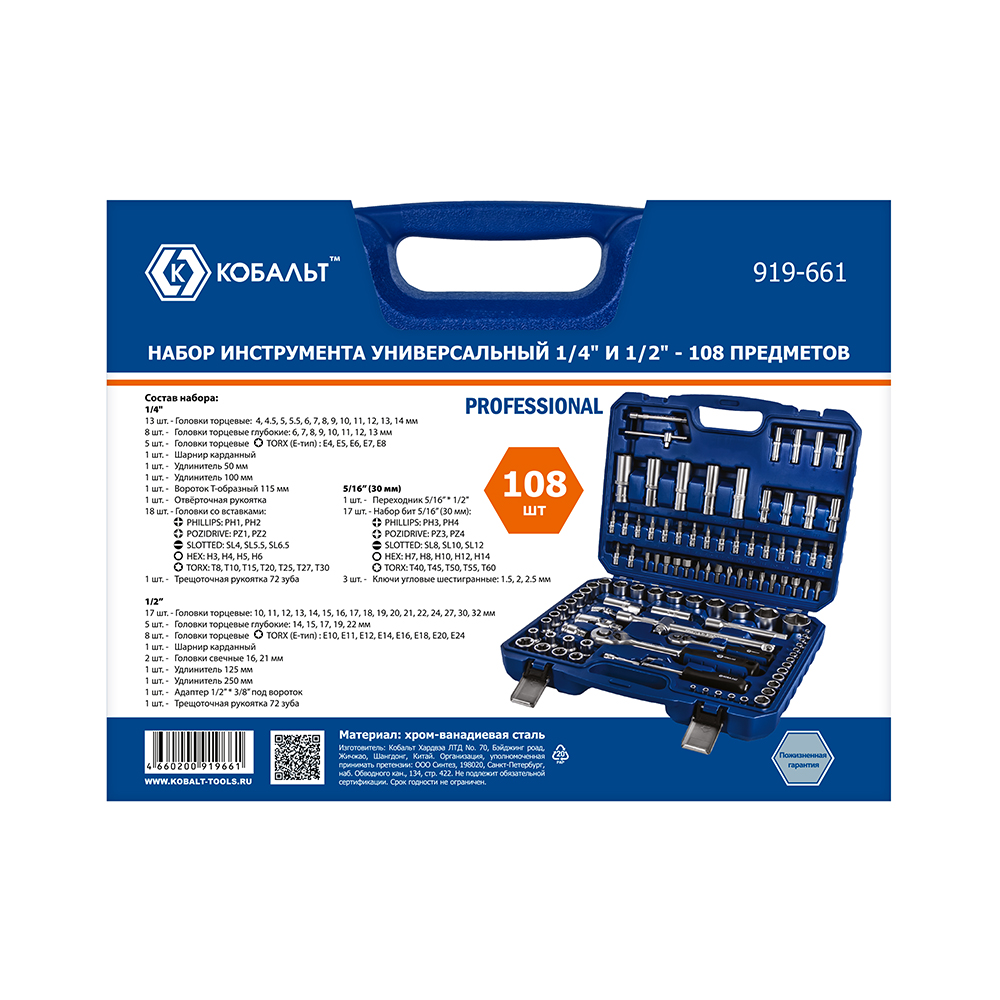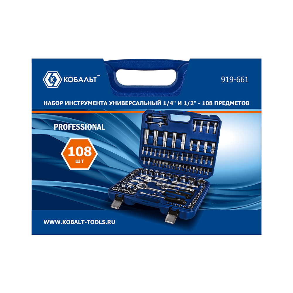 Набор инструмента универсальный КОБАЛЬТ 1/4" и 1/2", 108 ПРЕДМЕТОВ, кейс (919-661) - цена, фото, технические характеристики