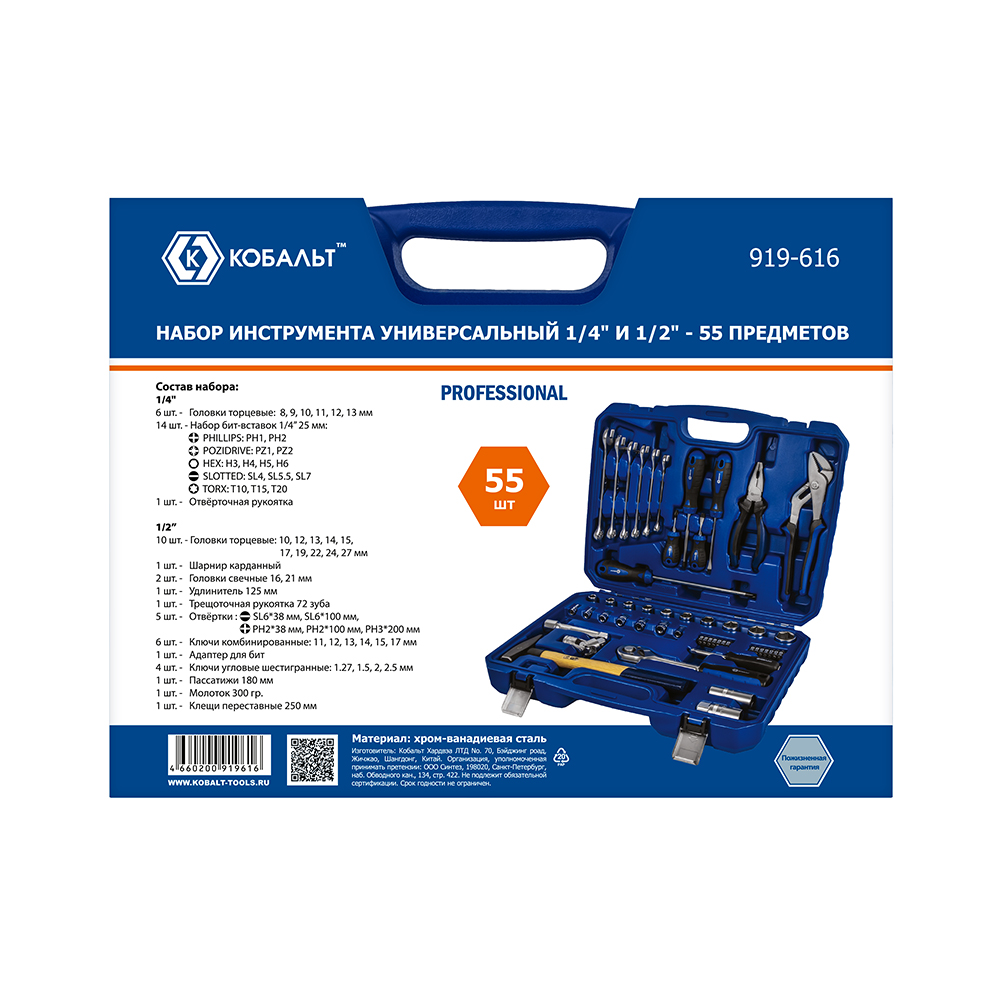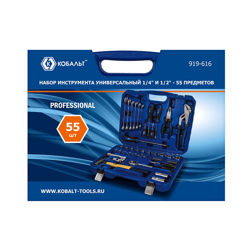 Набор инструмента универсальный КОБАЛЬТ 1/4" и 1/2", 55 ПРЕДМЕТОВ, кейс (919-616) - цена, фото, технические характеристики