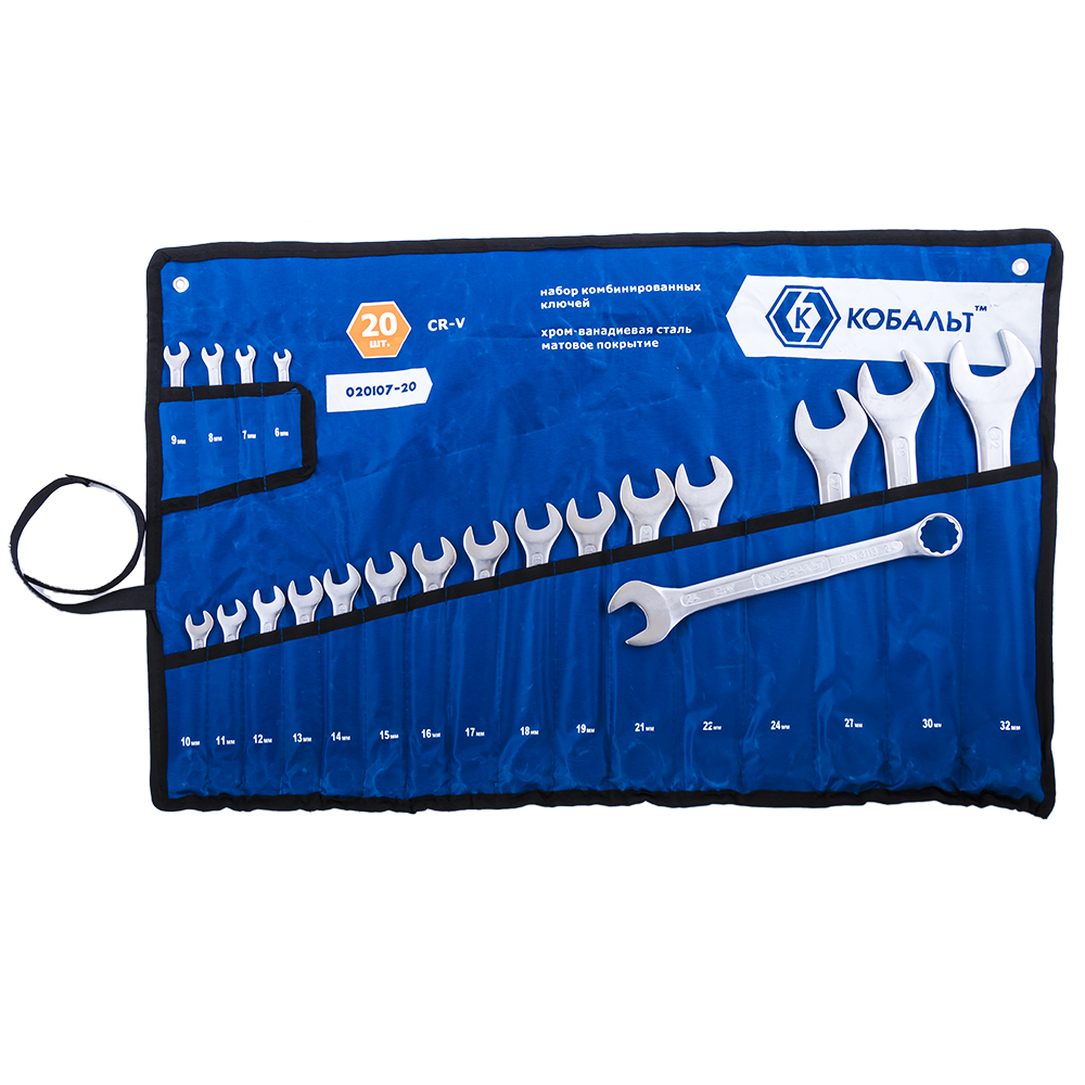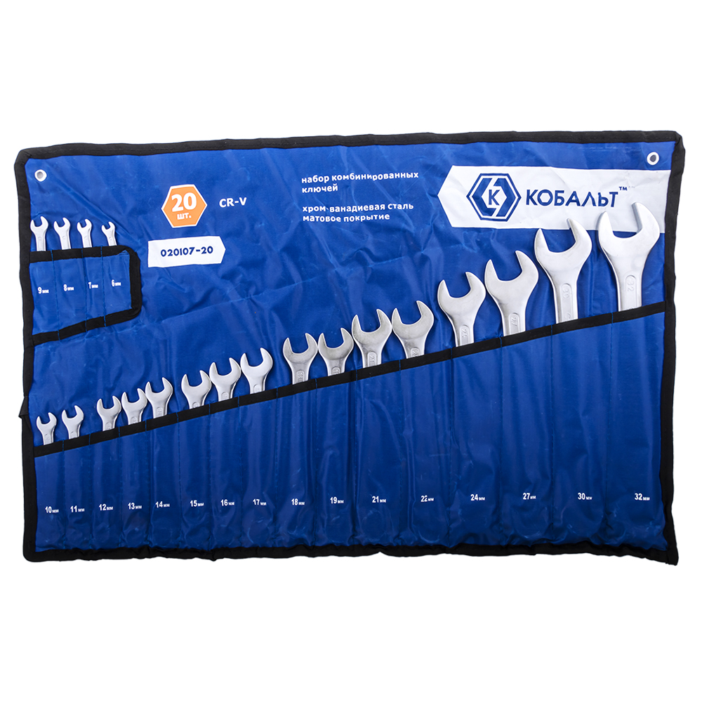 Набор ключей комбинированных КОБАЛЬТ 6,7,8,9,10,11,12,13,14,15,16,17,18,19,21,22,24,27,30,32 мм, 20 ШТ., чехол-скрутка (020107-20) - цена, фото, технические характеристики