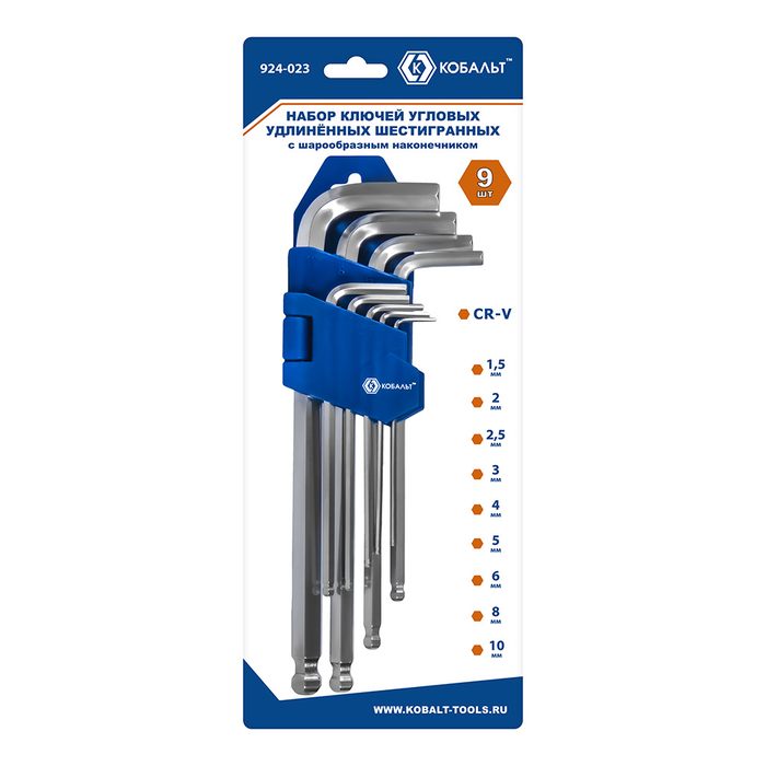 Набор ключей угловых удлинённых КОБАЛЬТ шестигранных: 1.5, 2, 2.5, 3, 4, 5, 6, 8, 10 мм, с шаром, CR-V, подвес (924-023) - цена, фото, технические характеристики