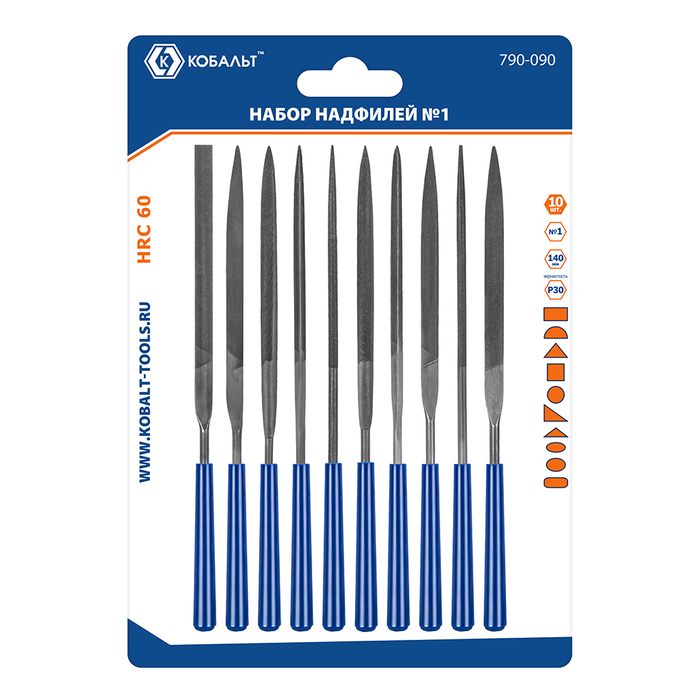 Набор надфилей КОБАЛЬТ насечка №1, длина рабочая/общая 140 х 60 мм, обрезиненные рукоятки, зернистость Р30, 10 ШТУК, блистер (790-090) - цена, фото, технические характеристики