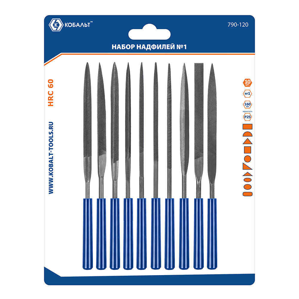 Набор надфилей КОБАЛЬТ насечка №1, длина рабочая/общая 160 х 70 мм, обрезиненные рукоятки, зернистость Р25, 10 ШТУК, блистер (790-120) - цена, фото, технические характеристики