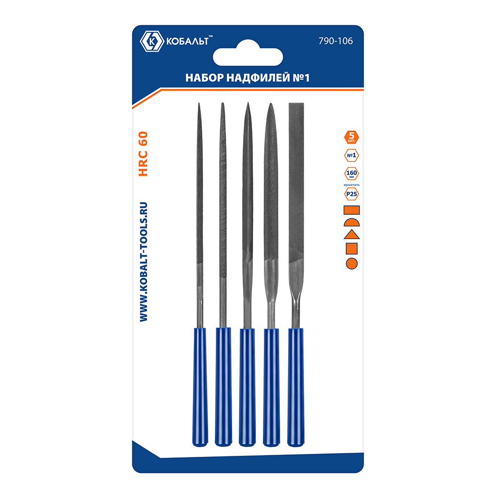 Набор надфилей КОБАЛЬТ насечка №1, длина рабочая/общая 160 х 70 мм, обрезиненные рукоятки, зернистость Р25, 5 ШТУК, блистер (790-106) - цена, фото, технические характеристики