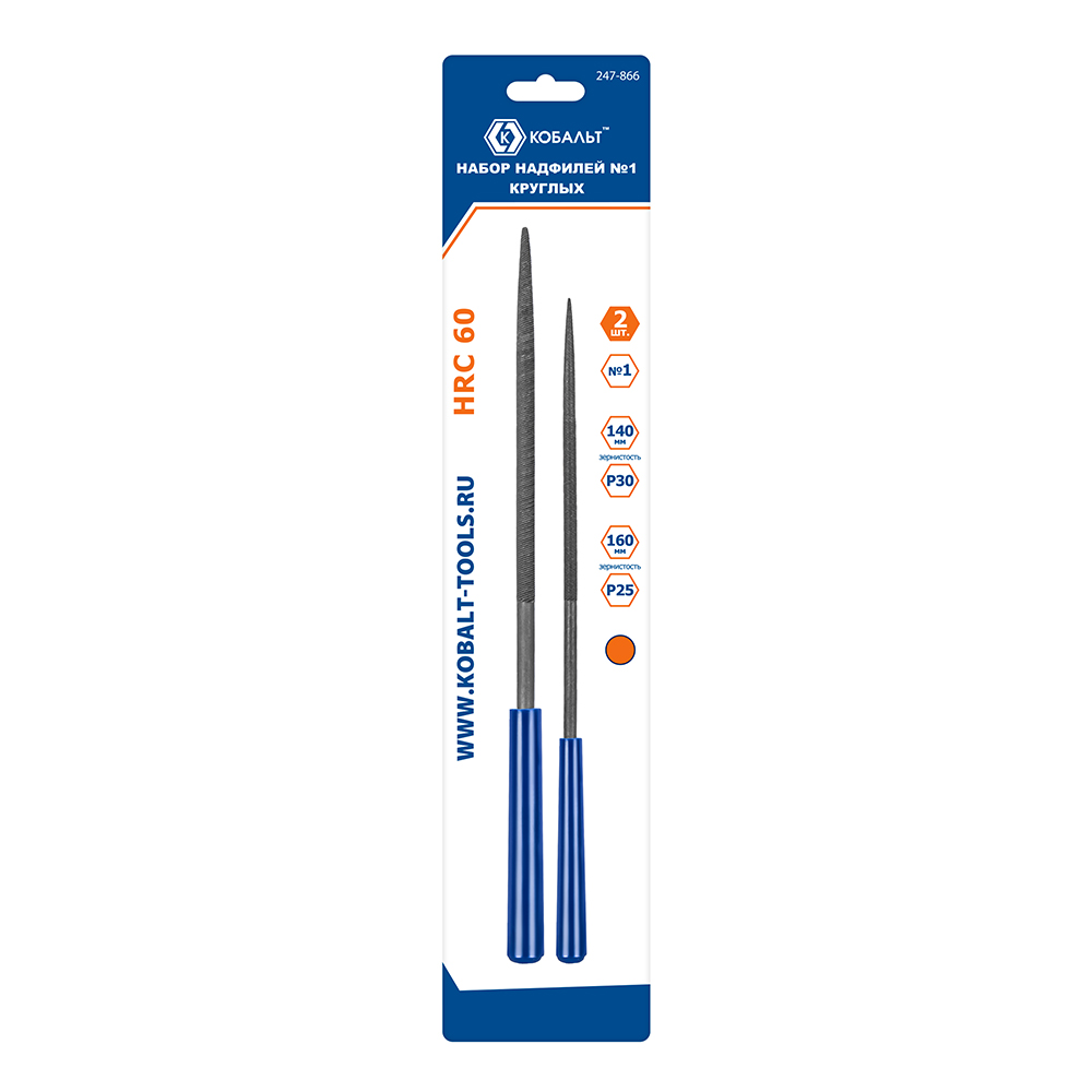Набор надфилей КОБАЛЬТ круглых, насечка №1, длина рабочая/общая 140 х 60 мм (Р30) / 160 х 70 мм (Р25), 2 ШТУКИ, блистер (247-866) - цена, фото, технические характеристики