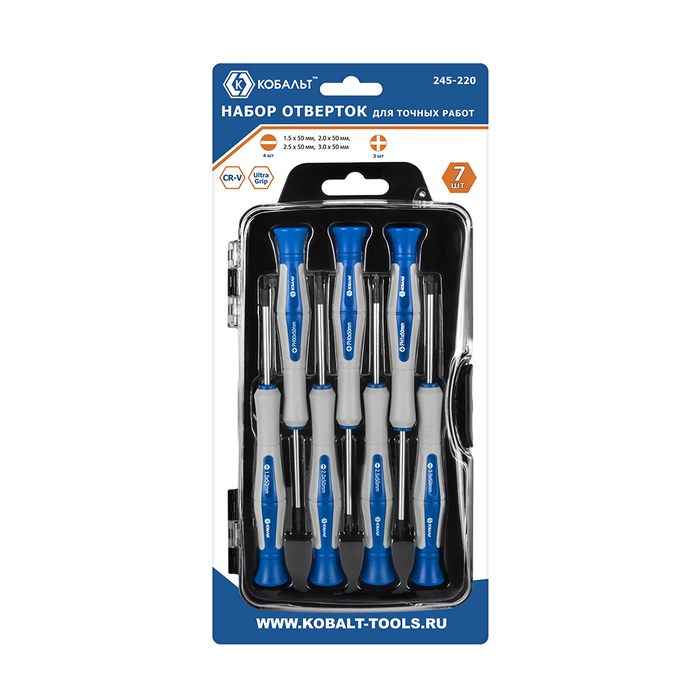 Набор отверток КОБАЛЬТ для точных работ Ultra Grip 50 мм, 7 ШТ: SL1.5, SL2.0, SL2.5, SL3.0, PH00, PH0, PH1, CR-V, кейс, блистер (245-220) - цена, фото, технические характеристики