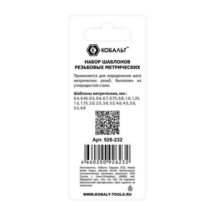 Набор шаблонов резьбовых КОБАЛЬТ метрических, диапазон измерений шага резьбы 0.4 - 6 мм, 20 шт., блистер (926-232) - цена, фото, технические характеристики