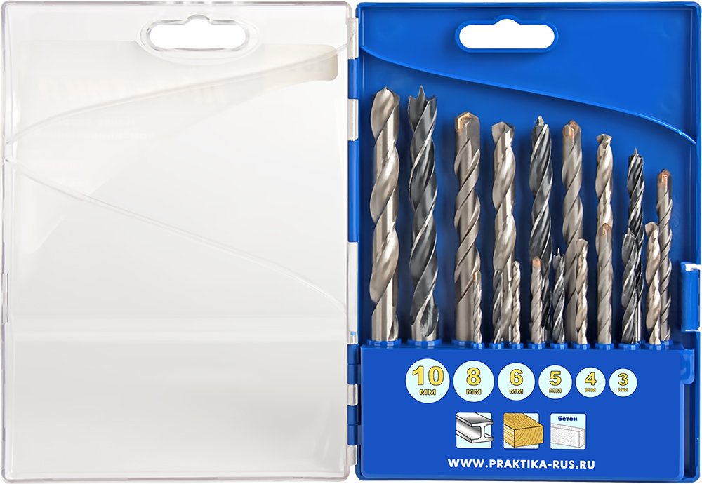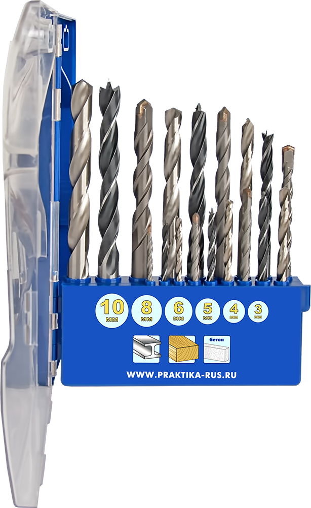 Набор сверл комбинированный ПРАКТИКА "Профи", 18 шт, металлу/бетону/дереву 3,4,5,6,8,10 мм (640-391) металлу/бетону/дереву 3,4,5,6,8,10 мм ПРО кассета