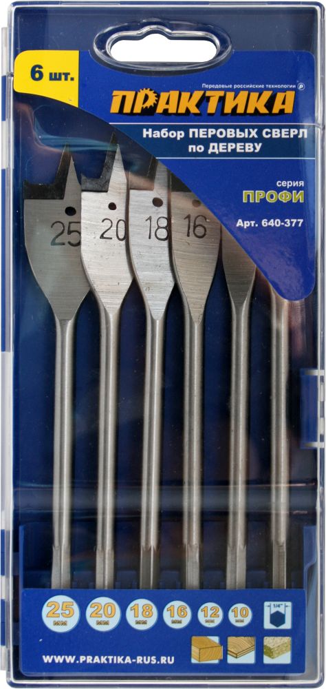 Набор сверл перовых ПРАКТИКА "Профи", 6 шт, 10, 12, 16, 18, 20, 25 мм, ПРО кассета (640-377) - цена, фото, технические характеристики