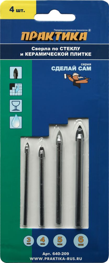 Набор сверл по стеклу и керамике ПРАКТИКА "Сделай сам", 4 шт, 3,4,5,6 мм, блистер (640-209) - цена, фото, технические характеристики
