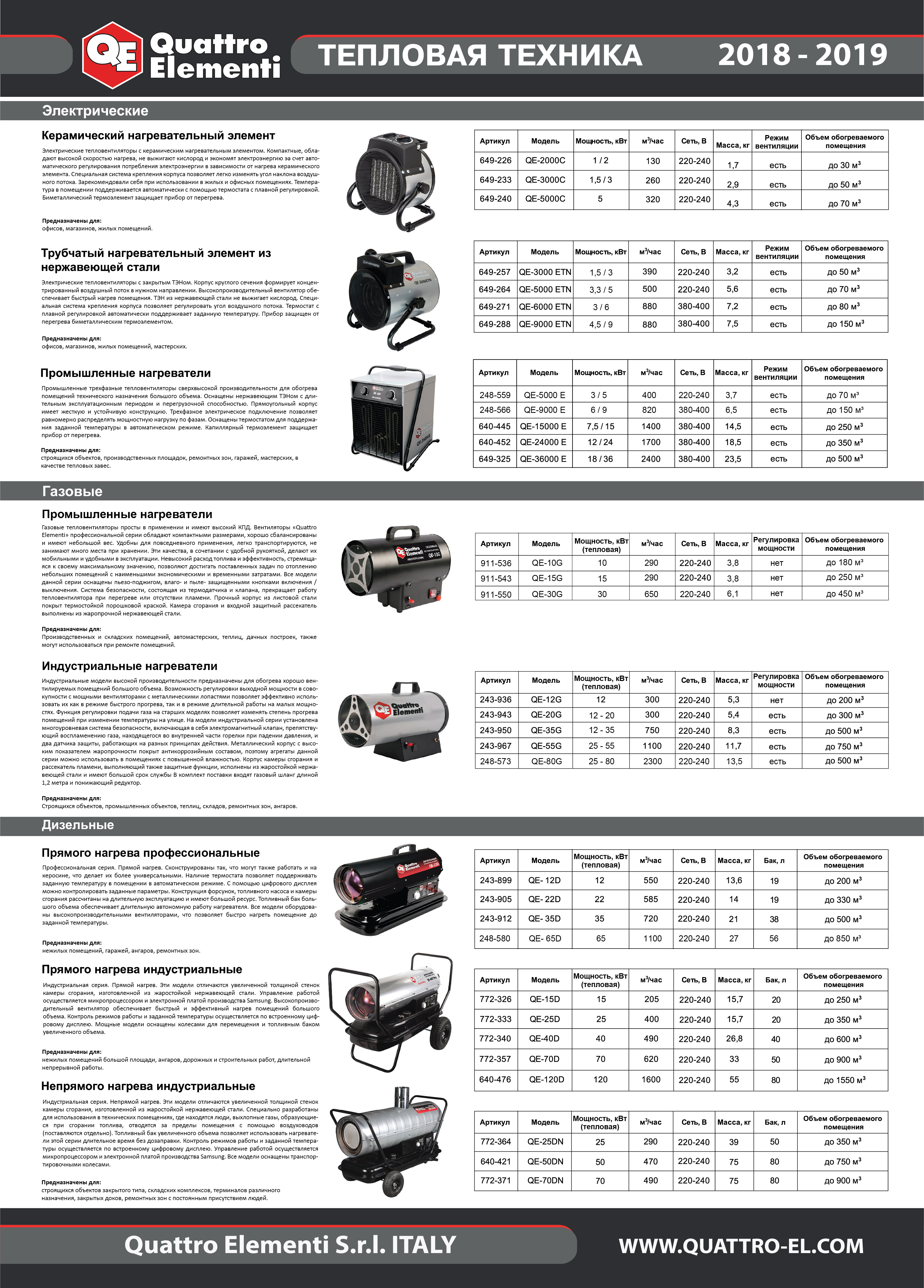 Нагреватель воздуха дизельный непрямого нагрева QUATTRO ELEMENTI QE-50DN (50кВт, 470 м.куб/ч, бак 80л, 4,7л/ч, 75кг) (640-421) - цена, фото, технические характеристики
