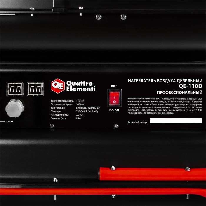 Нагреватель воздуха дизельный прямого нагрева QUATTRO ELEMENTI QЕ-110D (110кВт, 1300 м.куб/ч, бак 69л, 7.9л/ч, 40,8кг) (915-274) - цена, фото, технические характеристики