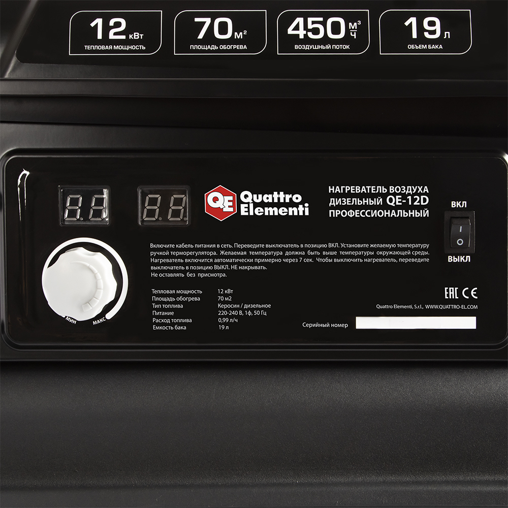 Нагреватель воздуха дизельный прямого нагрева QUATTRO ELEMENTI QE-12D (12кВт, 550 м.куб/ч, бак 19л, 1,1л/ч, 14,9кг) (243-899) - цена, фото, технические характеристики