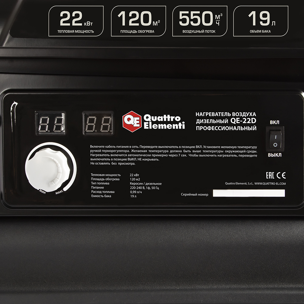 Нагреватель воздуха дизельный прямого нагрева QUATTRO ELEMENTI QE-22D (22кВт, 585 м.куб/ч, бак 19л, 2,1л/ч, 14,9кг) (243-905) - цена, фото, технические характеристики