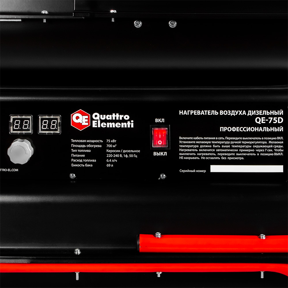 Нагреватель воздуха дизельный прямого нагрева QUATTRO ELEMENTI QE-75D (75кВт, 1300 м.куб/ч, бак 69л, 6.4л/ч, 40,8кг) (915-267) - цена, фото, технические характеристики