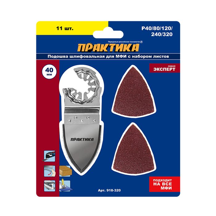 Насадка для МФИ ПРАКТИКА подошва дельта узкая 35мм, VELCRO, с набором шлифлистов P40/80/1 (918-320) с набором шлифлистов P40/80/120/240/360 - 10шт