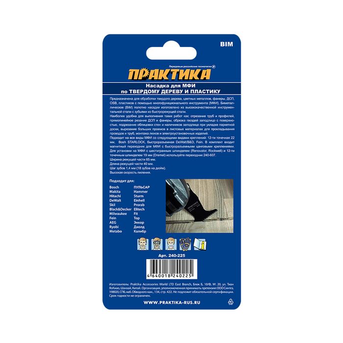Насадка для МФИ ПРАКТИКА режущая прямая, BiM, по твердому дереву, ДСП 65 мм, крупный зуб (240-225) - цена, фото, технические характеристики