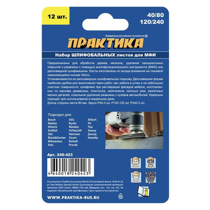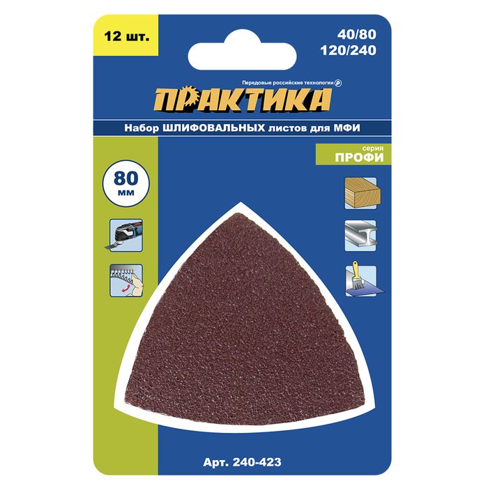 Насадка для МФИ ПРАКТИКА шлиф.листы, дельта, VELCRO БЕЗ отверстий 80 мм, P40, 80, 120, 240 (240-423) 80 мм, P40, 80, 120, 240, набор 12 шт.