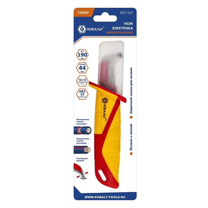 Нож электрика КОБАЛЬТ диэлектрический, 190 мм, с пяткой, частично изолированное лезвие 44 мм, блистер (921-121) - цена, фото, технические характеристики